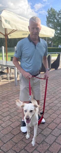 Jesper deltog ikke i matchen men gik en runde sammen med Fred, der er en tre-årig Bulgarsk gadehund, som nu har fået et godt liv i Danmark.